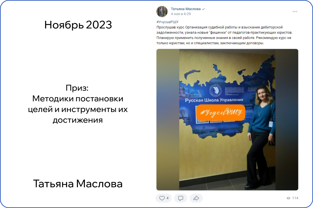 Выложите на своей странице во Вконтакте отзыв и фото с обучения в РШУ